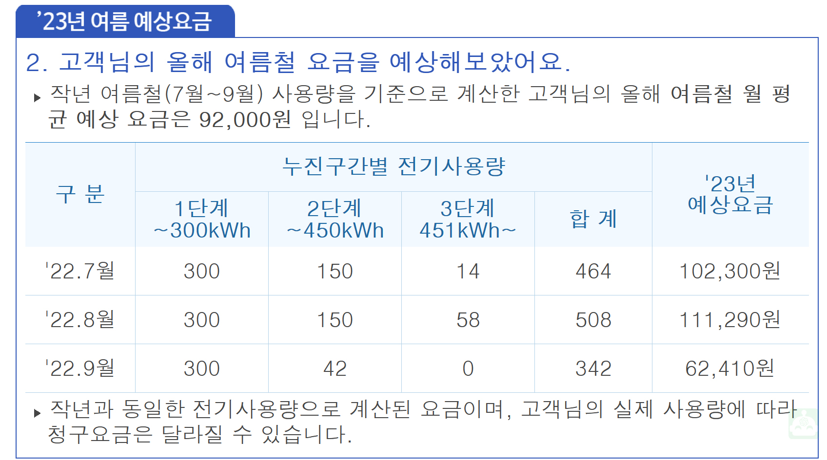 클릭해서 들어가보니, 23년 7,8,9월 전기요금 예상금액이 떠서 확인해봤는데, 22년도 7,8,9월에 사용한 전기량만 나오고, 금액은 얼마인지 나와있지가 않네요..