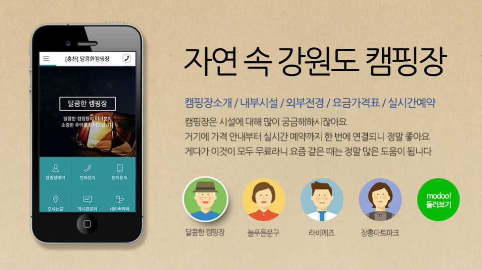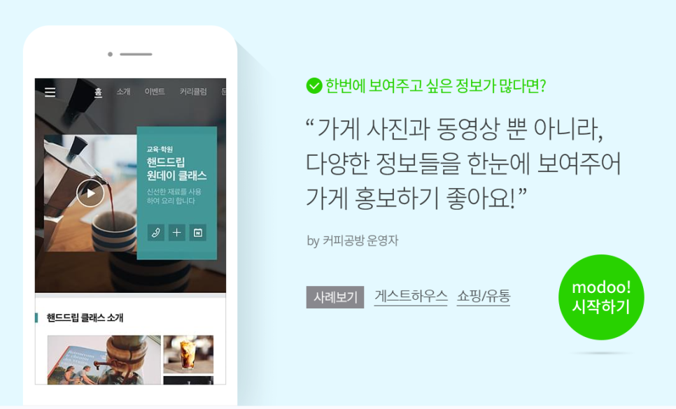 개인, 사업자, 기업의 홈페이지소개 및 고객 문의, 예약/주문, 위치 안내 등 홈페이지에서 꼭 필요한 기능페이지들을 지원하면서도 유지비용이 들지 않는 모두(modoo)를 통해 많은 분들이 홈페이지를 운영하고 있습니다.